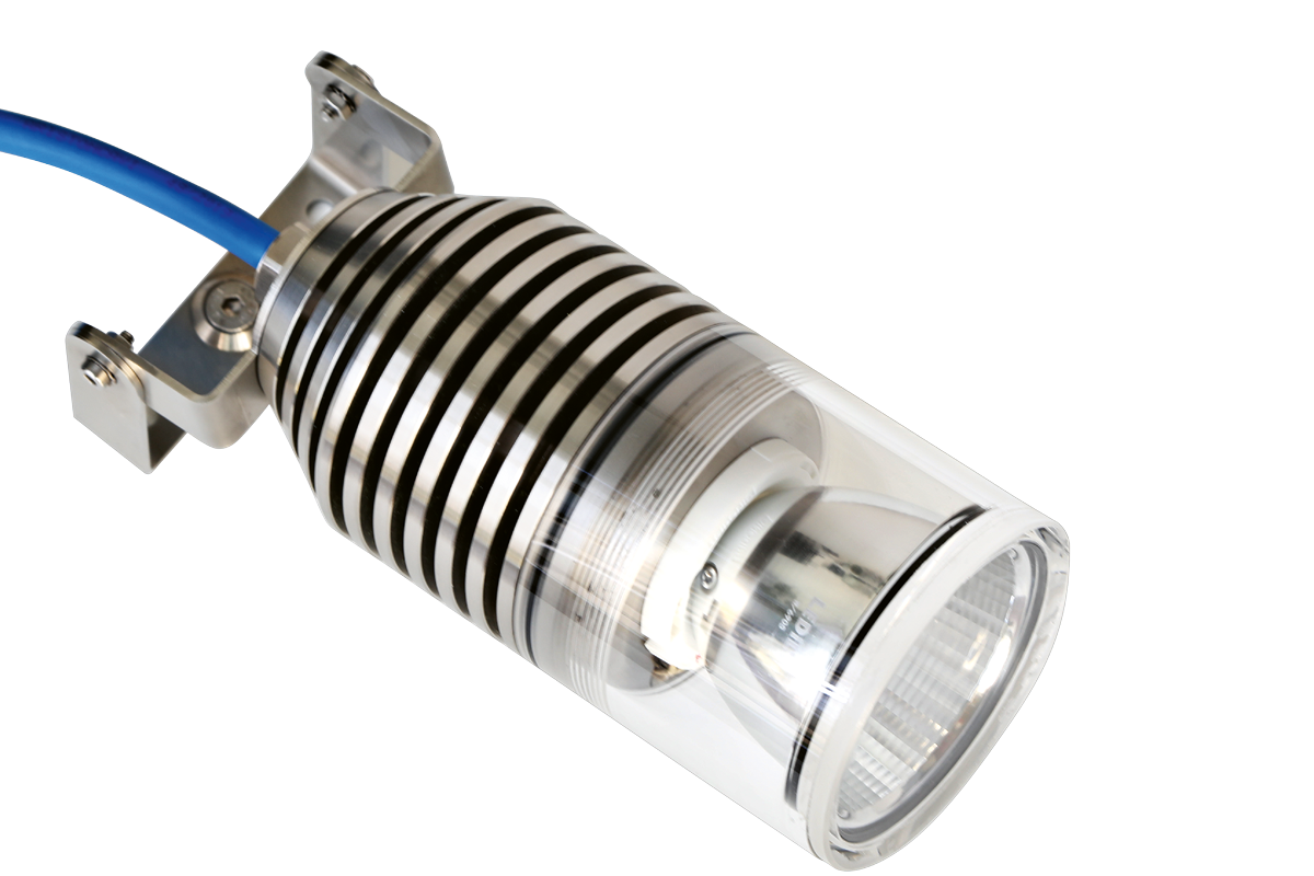 INARI M is ideal for illuminating deep filter wells: With the wire rope suspension, the spotlight can be safely lowered into a water depth of up to 30 metres. The 2.5 kg stainless steel housing serves as a weight. Because the suspension bracket, wire rope and thimble are also made of V4A stainless steel, these components are also extremely durable. INARI M is the perfect solution wherever the highest demands are made on robustness and tightness. Thanks to the mounting bracket, the spotlight can be fixed to walls or ceilings in any environment with a single screw. The housing with cooling fins guarantees optimum cooling of the LED module - even when mounted above water.